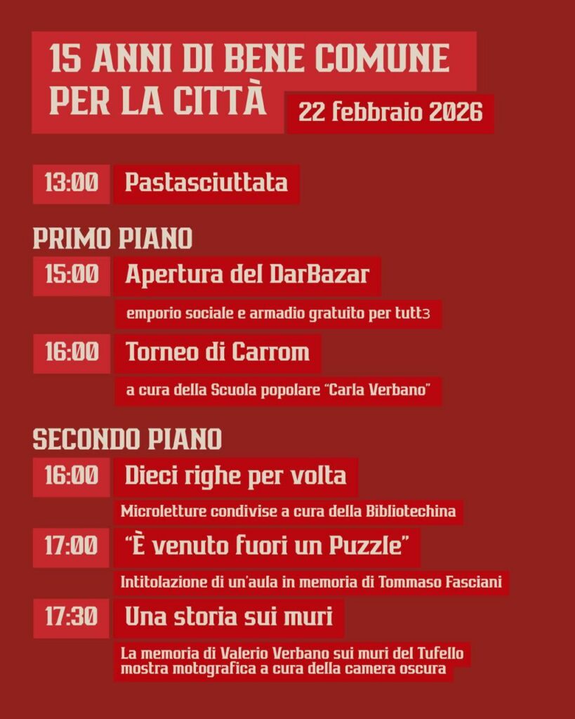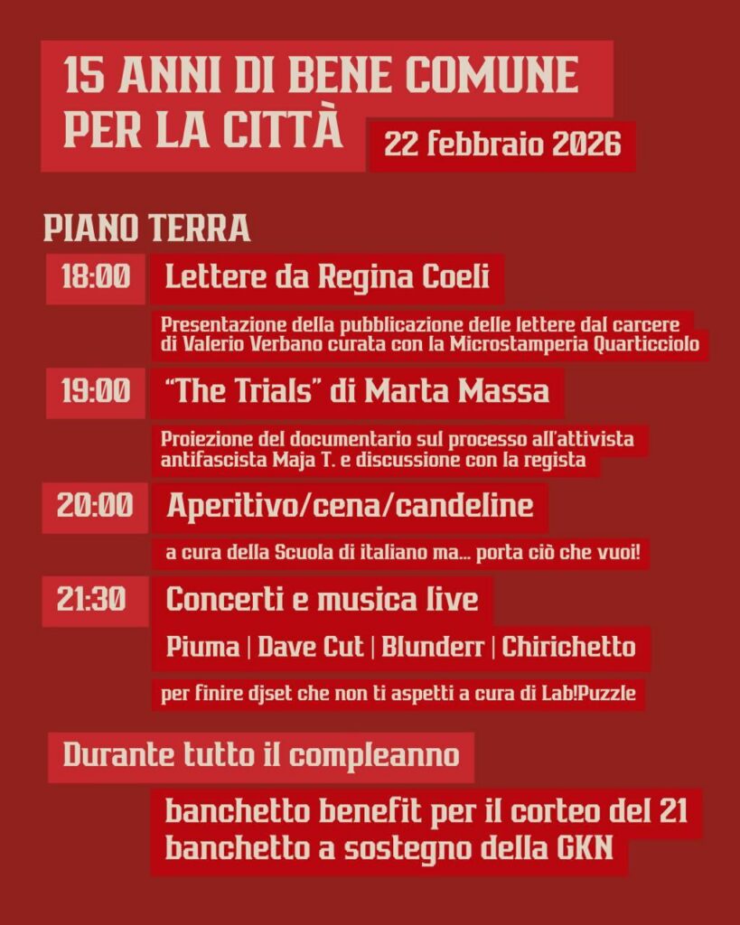Domenica 22 febbraio ci ritroviamo per mettere insieme un altro anno di progetti, autogestione e lavoro collettivo. Daremo voce alle lotte di ieri e di oggi, in un giorno speciale in cui la memoria di Valerio Verbano sarร messa al centro dal lavoro fatto con la @microstamperiaquarticciolo e dalla mostra della camera oscura. Ma anche una giornata in cui parlare della campagna internazionale Free All Antifas grazie al documentario di @marta.m.film sul processo allโattivista antifascista Maja T.