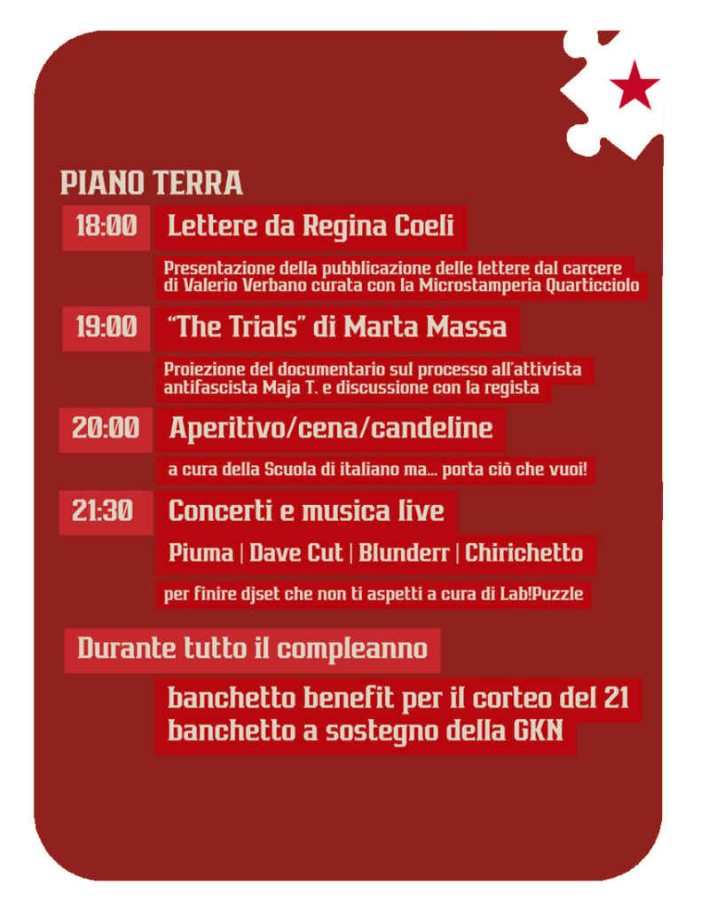 Domenica 22 febbraio ci ritroviamo per mettere insieme un altro anno di progetti, autogestione e lavoro collettivo. Daremo voce alle lotte di ieri e di oggi, in un giorno speciale in cui la memoria di Valerio Verbano sarร messa al centro dal lavoro fatto con la @microstamperiaquarticciolo e dalla mostra della camera oscura. Ma anche una giornata in cui parlare della campagna internazionale Free All Antifas grazie al documentario di @marta.m.film sul processo allโattivista antifascista Maja T.